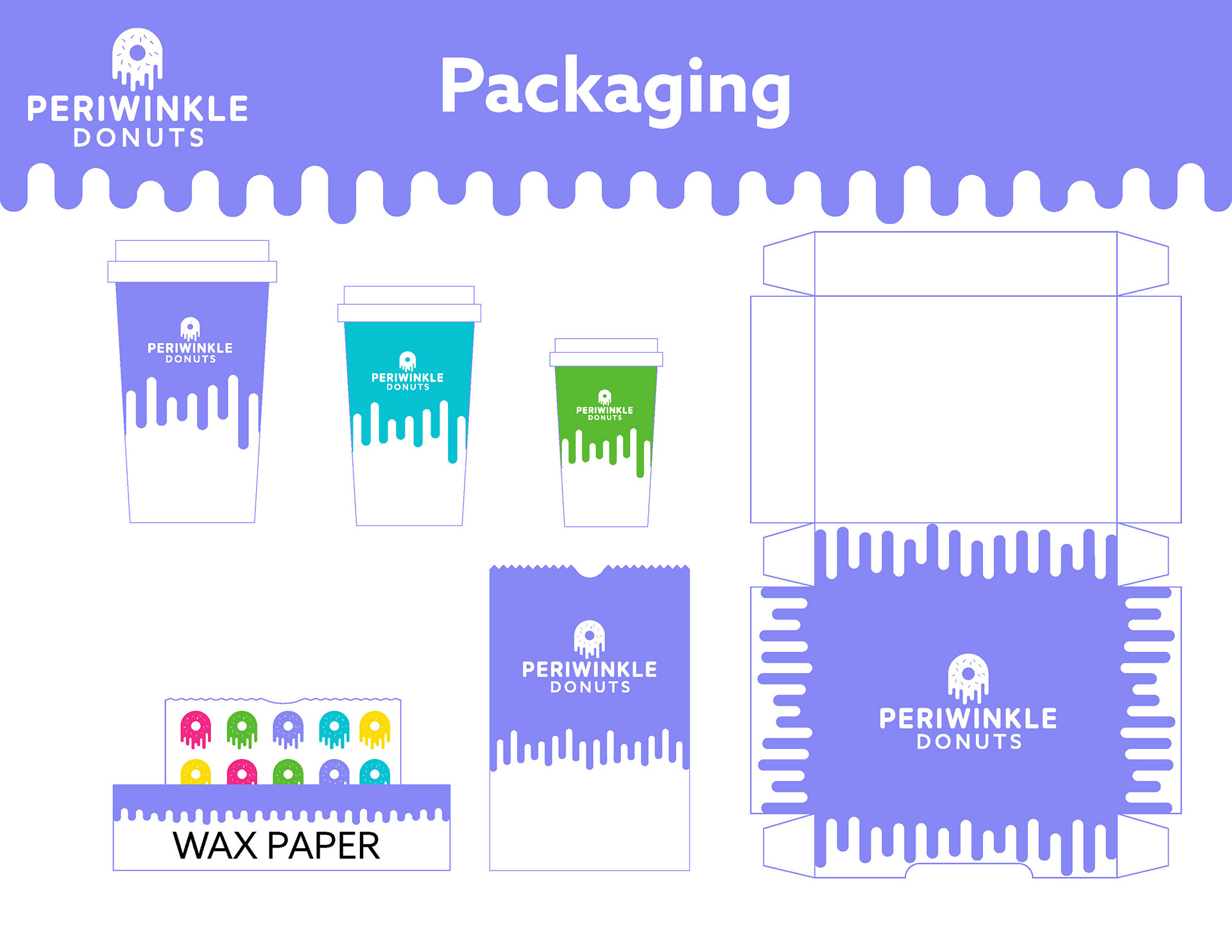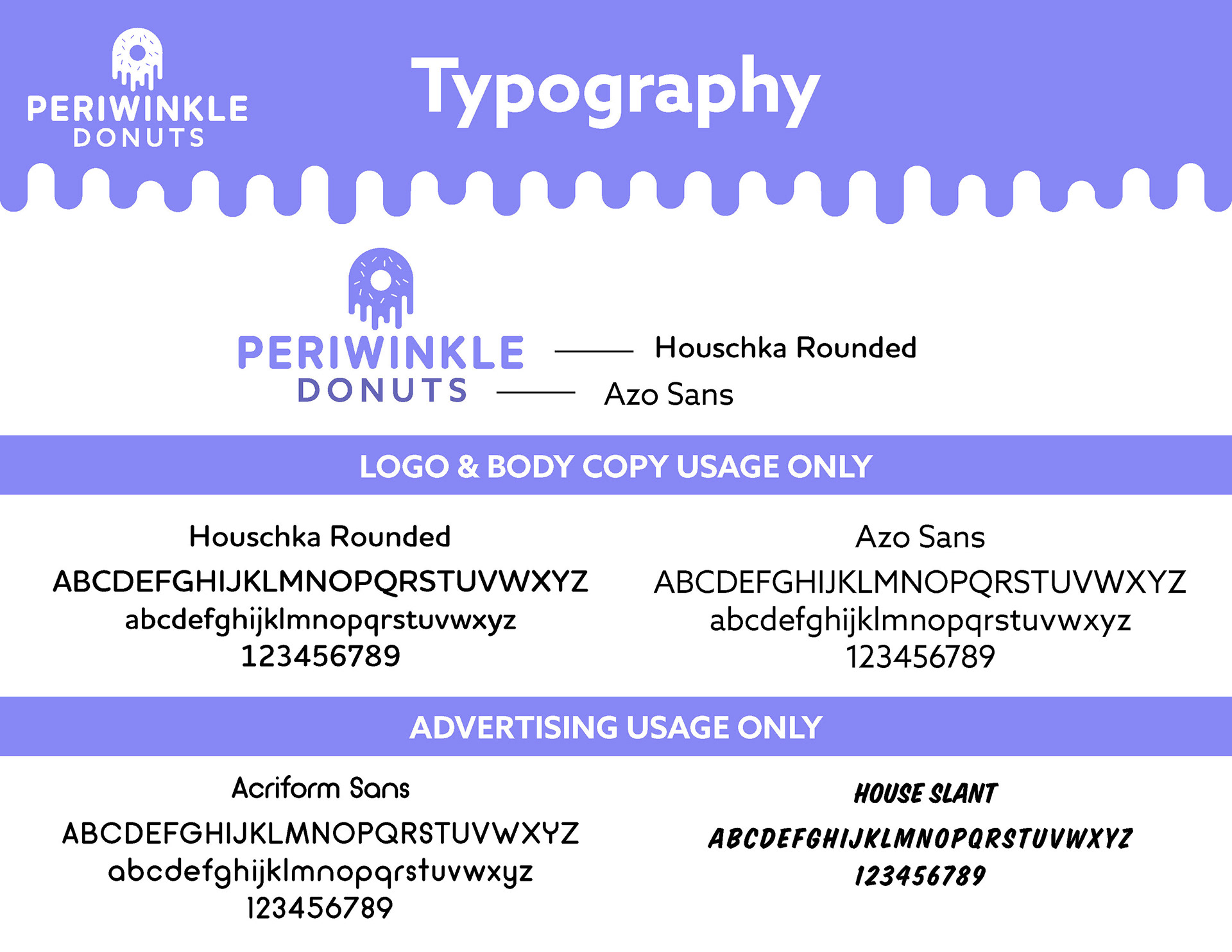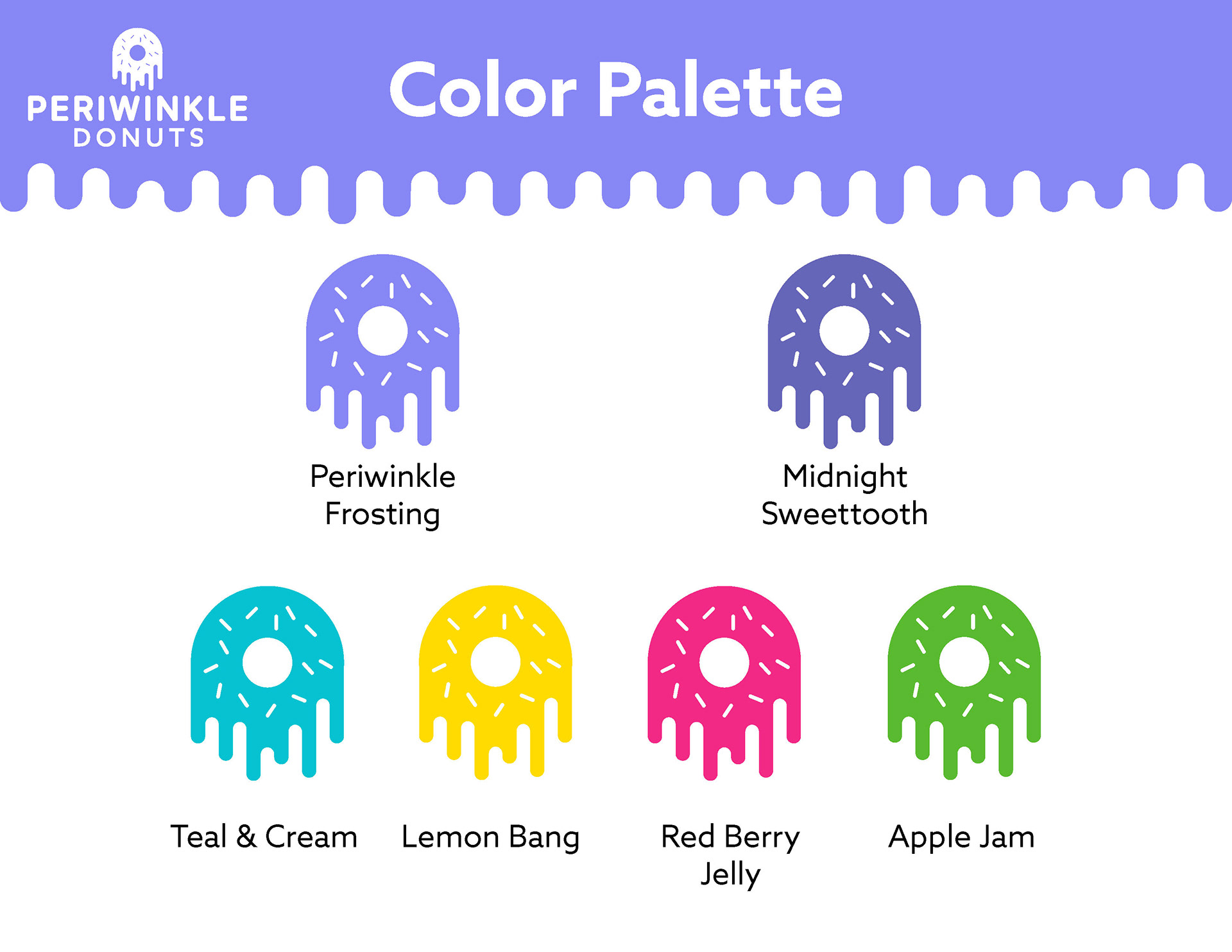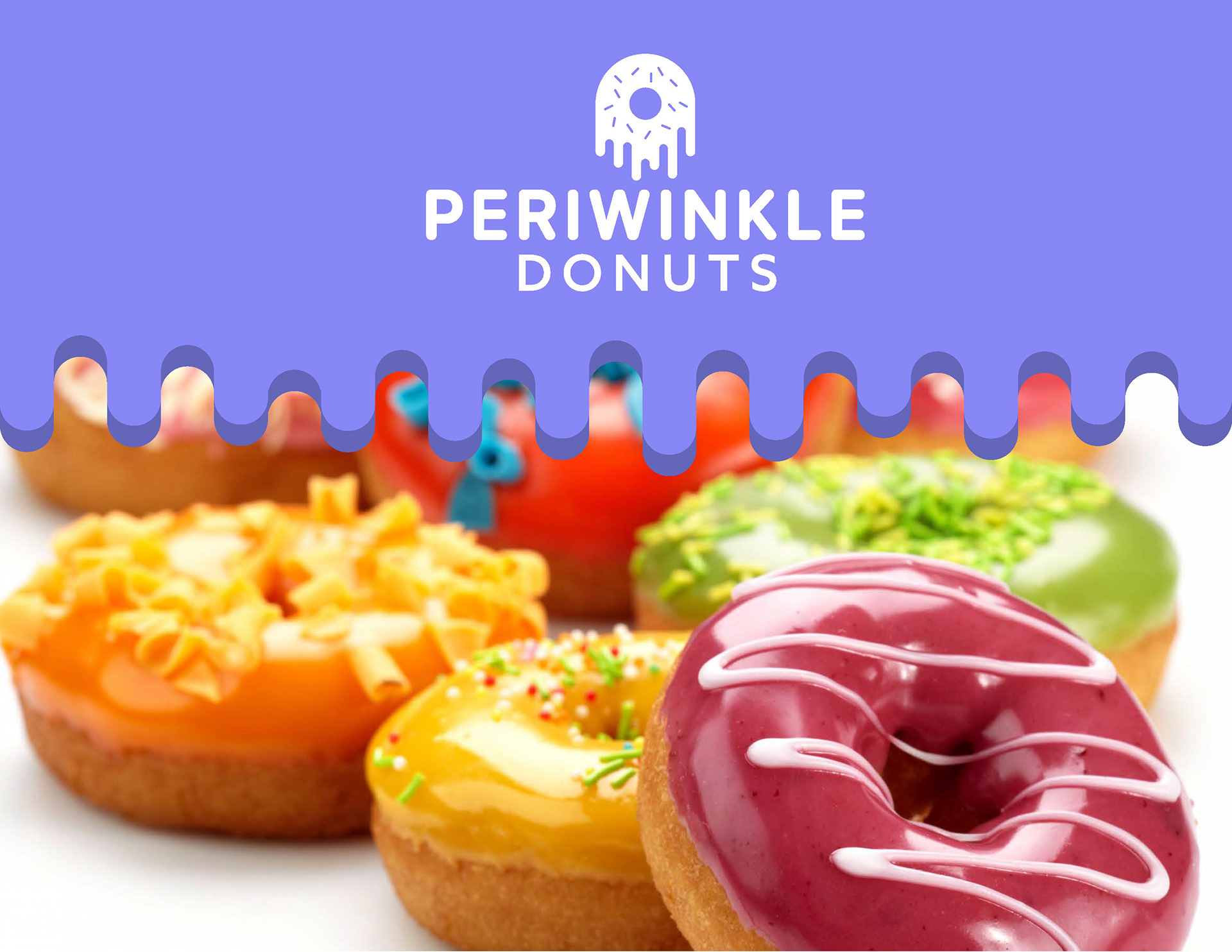 A multi-level branding guide for a fictional donut shop called Periwinkle Donuts