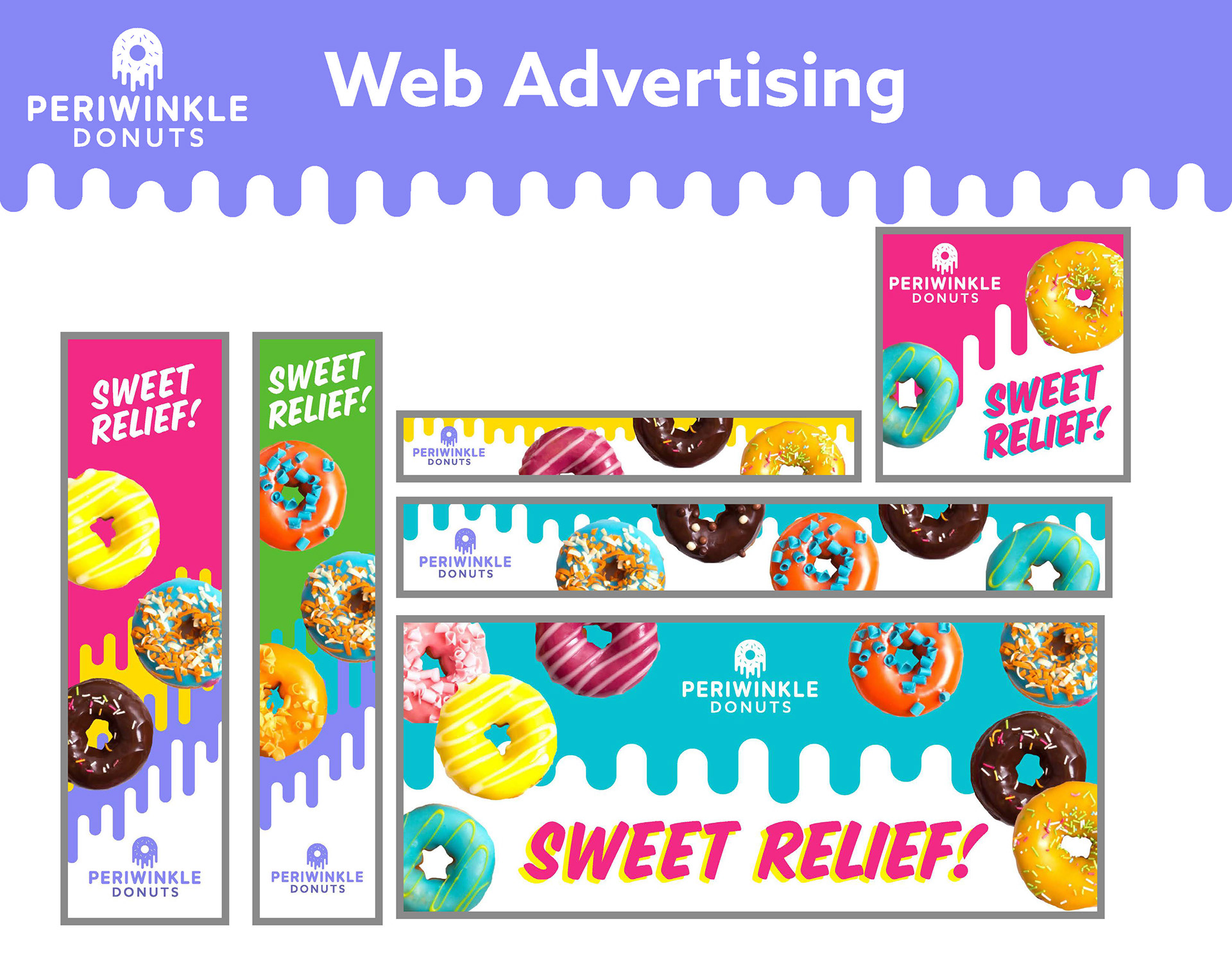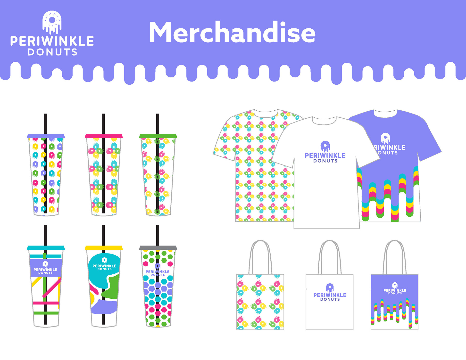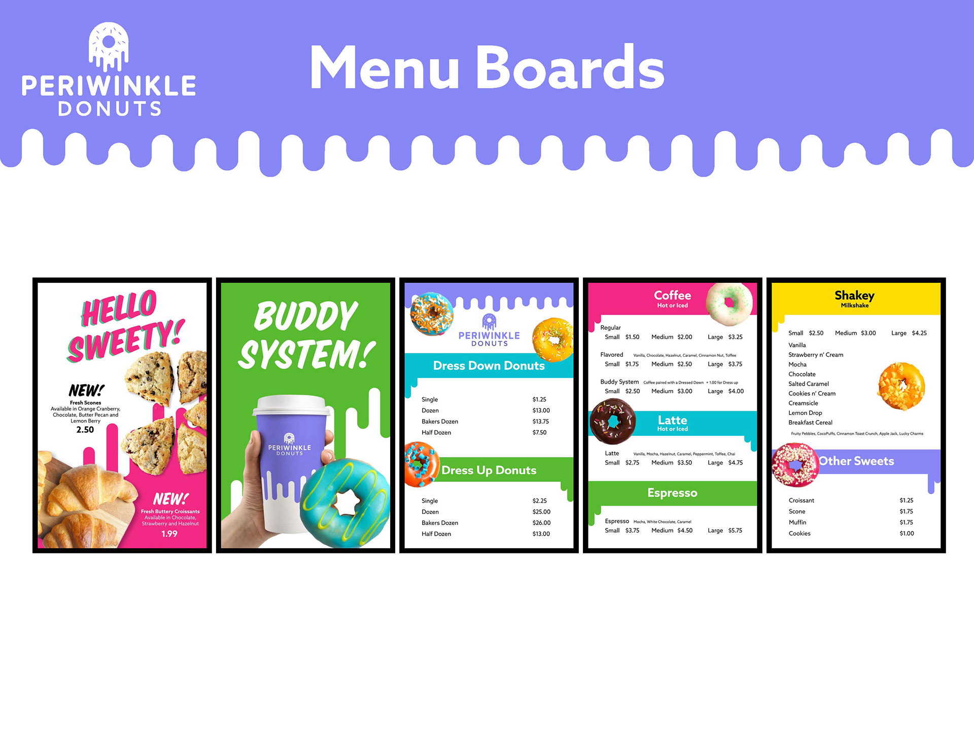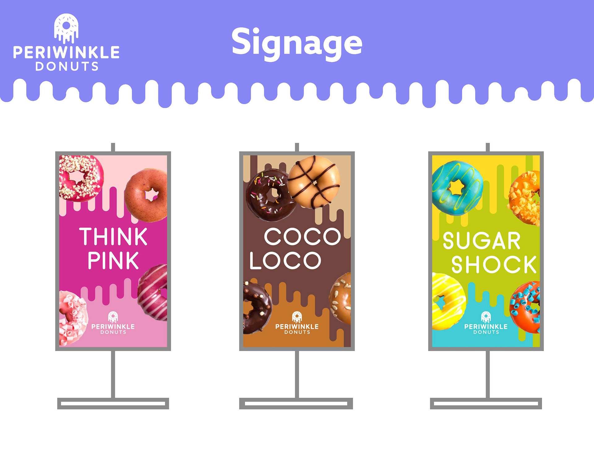 A multi-level branding guide for a fictional donut shop called Periwinkle Donuts